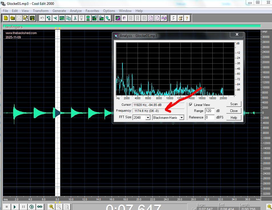 NPHighview is absolutely right! A simple C major is not enough. Yesterday, I tried the following frequencies: C5 523.3 D5 587.3 E5 659.3 F5 698.5 F#5 740 G5 784 A5 880 B5 987.8 C6 1046.5 D6 1147.61 E6 1318.5 F6 1397 Michael, your frequency is there too! A big THANK YOU to Volhout - I got the frequencies from your GitHub link. It sounds very much better, but it's still not quite right! Something seems to be wrong, especially with the higher notes... ![]() I absolutely have to determine the frequencies of the bells somehow. Could a small speaker function as a microphone on an oscilloscope? Frank |