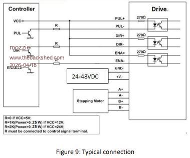 See the circuit diagram in Lyle's post at the top of this page. It shows the 3 input (+) terminals connected to Vcc. Make sure they are connected to 5V, not 3.3V. Edit. Downloaded the DM556 manual. Here are the relevant bits. Logic signal current 7min 10typ 16max mA PIN Details PUL+, PUL- Pulse Connection: Required. (1) 5V / 24V, optically isolated, differential. (2) Maximum 200 KHz input frequency. (3) Pulse width of 2.5μs or longer. (4) In single pulse (step & direction) control mode, this input signal represents a pulse which is active at the rising or falling voltage edge (set by DIP switch SW13); in double pulse (CW/CCW) control mode, this input signal represents clockwise (CW) pulse which is active at both high voltage level and low voltage level. So it looks like the transistors should be wired to invert the signals. 10kΩ from Pico pin to base, emitter to ground and collector to input (-). All input (+) to 5V. Pullup resistors not needed. With the scope connected between input(-) and Gnd. you should see inverted pulses going from about 4.5V to 0V Edited 2026-04-21 14:58 by phil99 |
