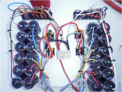 Phill diode is there, I wrapped 80% of the conductors in heat shrink so it couldnt touch anything else in between and the two ends go into the terminals behind the wiring you see. Gordon I figured as they are carrying minimal current it wouldn't be that critical. If its 20%max then we're talking 120W split over the three phases, split over the two sets of caps, so I assumed they'd carry 20W or so each, even if its 60W each @48V or better we're still talking very little current. If its that critical perhaps I should solder all my links instead of having connectors..... Karl Luck favours the well prepared |