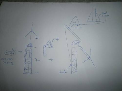 now need to concentrate on getting the tower up.... working bee anyone? Have to take down next door neighbors windmill, was a southern cross, fairly small tower three legs about 1m apart at the base work out how to add on up at the top a hinge mechanism. needs to be a self supported rig. This was my idea Karl most of the construction is incredibly light, i'll probably replace the wire cross pieces with angle steel. Luck favours the well prepared |
