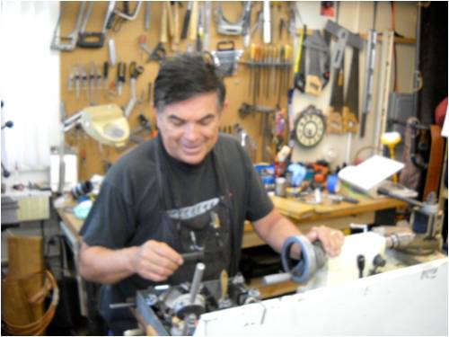 garage shed. He's standing in front of his lathe.