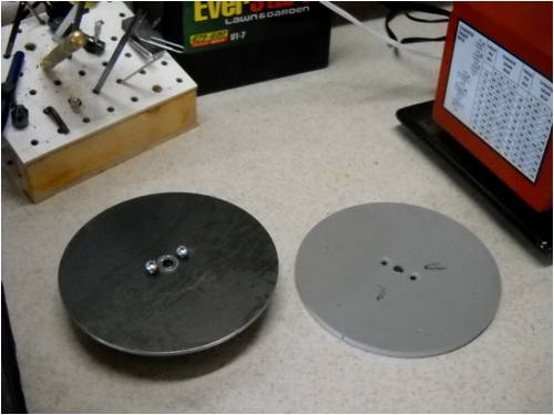 There's been a slight change in plans. Because of my limited machining capabilities, I chose to use an "off-the-shelf" die-cut piece of iron plate as my magnet-backing plate. Unfortunately, in a "perfect world" it should have been about 1/8th inch larger in diameter, but I think it will work just the same.