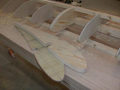 Continueing with the wing assembly aspect of the post... Here is a real good picture of the GEO222 wing profile that I used. It is important to dry fit and check all the joints for binding and tightness, take the effort and make everything fit "just snug" and not tight, because later you'll be glueing lots of pieces together in a short time span. Believe me...you don't want to have to stop to make a proper fit on a few joints while the glue is drying on several other pieces next in line. Also, the glue will swell the wood slightly and make things fit even tighter than when dry fitted. You can also see the differance in thickness in the ribs I've set out in front for you to see, the thin ones are for the main wing, while the thick ones are for the attachment areas. Notice the grain direction, some books say to lay it at a 45*-while others say 90* for strength, depends on what the rib is made of and how the material reacts during compression tests, but basicly speaking its stronger when the grain is vertical to the cord of the wing.