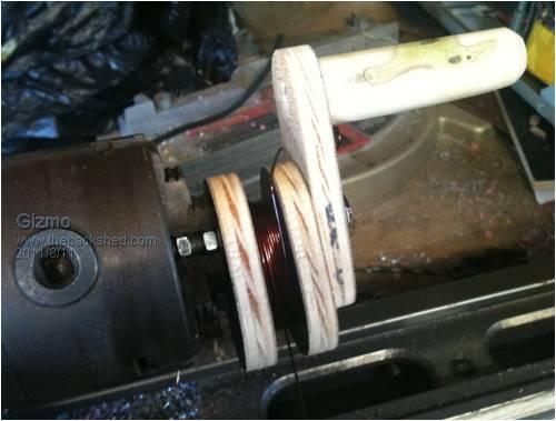 Just an update. Picked up the copper, and started winding coils. Used the CNC to make some coil formers. This is the wire tensioner, it works brilliantly! Phills suggestion, make some little paint brushes for laying down the epoxy as I wind the coils. I found some twigs in the yard and hairs from a old paint brush. Winding the first coil. I ended up using the lathe to support the coil former.