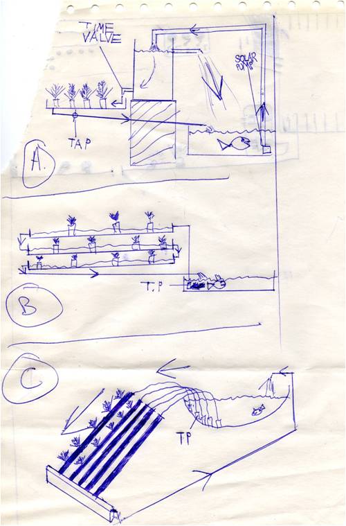 C. Simmilar to B but instead of stacking upwards the pipes are level next to each other horizontally. Although the pipes flood simmilar to A.'s plant bed. Slow return to the pond held up by an irrigation tap. I think...1 pump per pipe... as manifolding equal amounts to each pipe may be an issue to regulate.