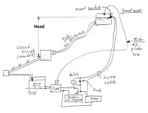 B. is a gravity pipe version. Pump pumps water up to top pipe vetically. Gravity carries water back to pond via each pipe by falling. Not what I want to do but idea for piping came from that. Usually people push a constant flow of water through this, slow pumping all the time. This will drain the battery in this design. Not good!