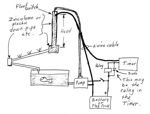 Alternatively, you could simply have an overflow that goes back to the pond so the pump runs continuously while the relay is operated by the Timer.