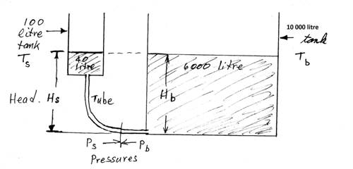 The diagram shows a 100 litre tank connected via a tube to a 10,000 litre tank.