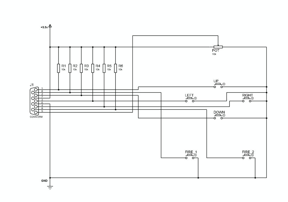 Hi Nick , I forget to tell you that all button are pulled up with a 10K resistor. The normal state is 1 and when you press a button you get the 0. Here is my joystick test program : 'Amiga Compatible Joystick test for Maximite ' CLEAR CLS 'PIN 11 = UP SETPIN 11,2 'PIN 12 = DOWN SETPIN 12,2 'PIN 13 = LEFT SETPIN 13,2 'PIN 14 = RIGHT SETPIN 14,2 'PIN 15 = Button 1 SETPIN 15,2 'PIN 16 = Button 2 SETPIN 16,2 'PIN 1 = Potentiometer SETPIN 1,1 'Main Loop DO While 1 locate 0,0 : print "UP = ";PIN(11);" " locate 0,20 : print "DOWN = ";PIN(12);" " locate 0,40 : print "LEFT = ";PIN(13);" " locate 0,60 : print "RIGHT = ";PIN(14);" " locate 0,80 : print "BUTTON 1 = ";PIN(15);" " locate 0,100 : print "BUTTON 2 = ";PIN(16);" " locate 0,120 : print "POTENTIOMETER = ";PIN(1);" " loop here the Schematic :