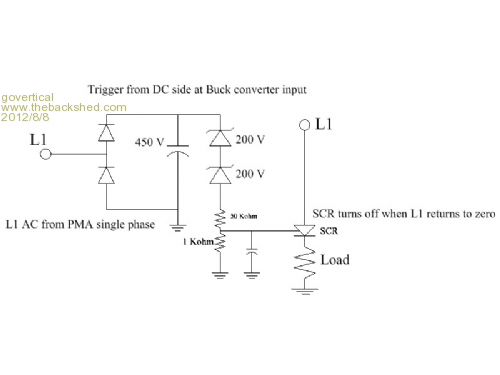 Hi, I order the parts before I understood Steve’s circuit. I do not know if the Zeners will breakdown at 400 volts. The trigger signal is from the DC side at the buck converter input. L1 is from the AC side; single phase; from the PMA. If the SCR fires it will reset when L1 returns zero. Load could be a heating element so the PMA stator would stay cool. May be a possible solution for the input over voltage protection circuit. Comments welcome