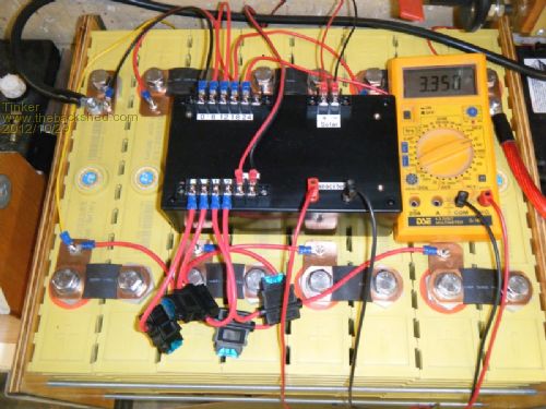 Its an unusual set up you have there William, quite different from what I have. Here its just 16 Winston 200Ah cells connected for a 48V system. There is also an entirely separate 400Ah LA based system that runs the lights via its own 24V inverter and separate power wiring. Let me outline what my lithium balancing system does: It connects one cell at a time to a 'bus', this is done by DP relay contacts. The voltage on this 'bus' is displayed on a 7 segment module plus the number of the cell monitored. So I can look anytime at the display and see each cell voltage displayed in turn without having to grab my DVM. Onto this 'bus' I can also inject a preset (adjustable) voltage, which is set slightly higher than the expected max cell voltage. What happens then is as follows: the cell with the lowest voltage potential draws a bigger current from this injected source than the cell with the highest potential. So each cell grabs whatever current it requires in order to get its potential equalised to all other cells. The cells end up equalising to within around 10mV of each other at the top of the charging voltage. They are balanced much closer than that at the overnight battery bank 'running' voltage. I'm talking about equalising currents in the range of 0.5Amp for the lowest potential cell. This assists with the selection of the relays which are the heart of this system. Everything is controlled by a picaxe microprocessor. The choice of relay is important, I started with miniature automotive relays with 30A contacts for my 24V supercap system, where high current spikes were encountered. The latest system uses 2A relays with a high DC switching voltage. The relay *has* to have a small foot print since 8 of them have to fit on a smallish PCB. The price of each is also a consideration as so many are required. Since each relay only turns on only once every minute or so the stated "ten million operations of the contacts" should last a few years even if the system runs 24/7. Its easy to use this system manually but I'm trying to make this all automatic, starting when the bank is fully charged. Note, the bank is *only* equalised after it has been fully charged by my Outback charge controller.. This may not happen on overcast days. The 'automatic' system is presently working mostly but I'm still chasing a fault that happens when full sunshine alternates with dense clouds as the battery reaches full charge. Now I'm waiting for an electronic timer to see if that gets around the cloud issue. I hope that by now you realise this is not a simple system, certainly not a weekend project. Also, *NEVER* underestimate the charge in a 100+AH lithium cell, it can instantly vaporise relay contacts, fuses & PCB tracks if allowed to. I speak from experience here .This project might also be on par with the cost of a commercial one but I really do not want to know how much I've spent on it during the 4 years I have been tinkering with it. I never owned a commercial Lipo balancer so I cannot compare performances either. I took it on as a challenge, are you up to it and want me to continue? Klaus |