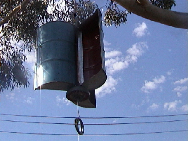 Hello Bart,yes today was THE day.Out of bed at 6am and in the garage for one more final modification(I wish)6 hours later and hurray the eagle has landed.Up up and away my beautifull windmill.Looks like a UFO in drag(pun intended).Not a lot of wind but glorious to watch.I am contemplating another on top. But before it drops out of the tree and becomes my disarster I need to fit a fall arrestor.So off to the auto wreckers for a seat belt tensioner.As for the design it's a combination of 5 years of model testing and everything I could glean off the net.And then adding it all together.Is it efficent only time will tell.Yours is massive at 3 meters mine is only 1 meter dia.But it's all good fun.I hope to try the counter rotating at some stage also.From the sounds of silence VAWT if I can figure out how to upload a video I'll post that soon.Got to get back to my forbidden fruit(Belgian beer) and pat myself on the back yet again.What a day.And it even looks like it's grid connected. Anthony