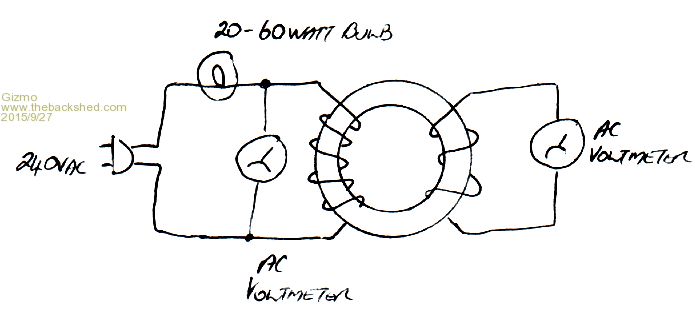 Now in this case, because we dont know how many turns are on the primary or secondary, you need to wind a test coil. Wind say 5 turns of wire ( any old wire ) through the transformer, and connect a multimeter across it. Then connect up the 240v winding like above, with the bulb in series. Power it up, and take note of the multimeter readings on the test coil, and check the multimeter on the primary is somewhere around 230v, give to take 10 volts.. Say the test coil measured 10 volts, we can work out the ratio's. 10v / 5 turns gives 2 volts ac per turn. Glenn The best time to plant a tree was twenty years ago, the second best time is right now. JAQ |