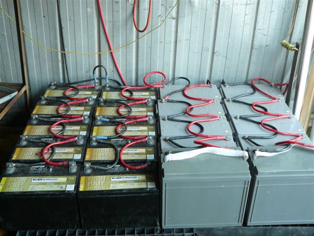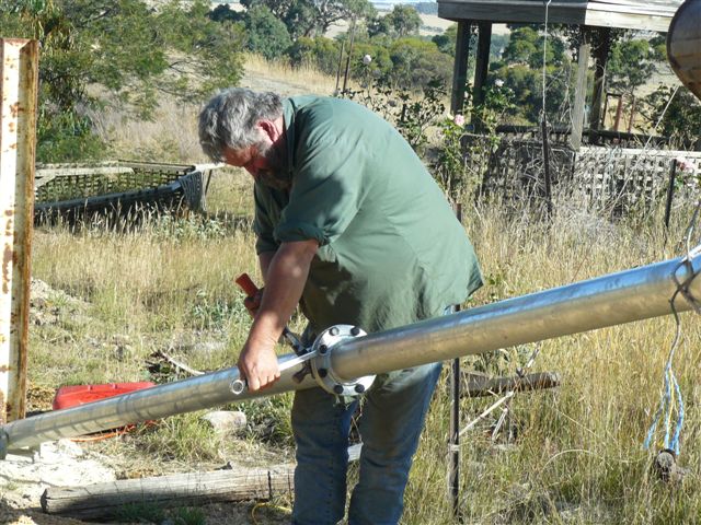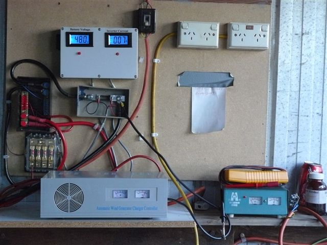 Hi All, First of all Happy New Year to all. Well finally I got up to the "Farm". it was a couple of very warm days (30 degrees plus)in Dereel, Victoria near Ballarat where the farm is. We finally got the Windmill up and going after I put the blades on back to Front and it did not want to turn, so we turned the blades around and it worked. but it still needs a fair amount of wind to make the wind generator charge the batteries. We still have to change the tail around as my brother in law put them on upside down. ( No assembly instructions on how to put the whole lot together). The only instruction was for the balancing of the prop, (only making the blades equidistant). All went well the blades were balanced to within the 5 mm as recommended by the manufacturer and we raised the generator again, we used an old tank stand to assist with the raising and lowering of the contraption, we used a 1.5 ton excavator to raise and lower the mast, worked well with some strapping to hold things in place during the operation. Here are some photo's of the installation Here are the 1 KW and 500 watt wind generators, 1 KW is on the left. This is the 1 KW wind generator with the tank stand. Here is the battery bank all batteries are 88 Ampere hours making a total of 480 Amp/hours at 48 volt. Some serious current capacity. Connecting cables are 7x7x34x0.12 mm or 4 gauge. This is the controller and the battery monitor box which shows net amps in or out. This is another shot of the controllers. Here is a shot of the (now redundant the green box is the 24 volt one) 24 volt rectifier box with the controller for the 48 volt system, I checked the 24 volt box and found that there is no control at all from the 24 volt box. by the way does any one know where we can get a 3 or 4 sided antenna tower of about 10 or 15 meters high? we need to go up higher to overcom the effects of the trees. limited greenie |
