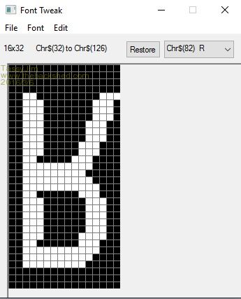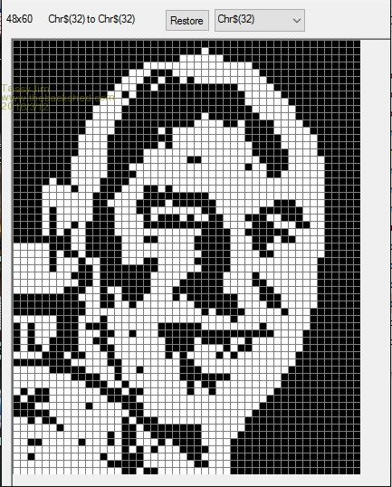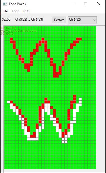 6> When you first open the app there is no X x Y properties shown, but there is an area for editing. If you create something, then Save the file, you can open it again and it will return as Chr$(0). If you then use Ctrl-N to create a new character, it adds Chr$(33). A bit of logic/tidying needed here (possibly disable SAVE) until either NEW or OPEN has been used?)