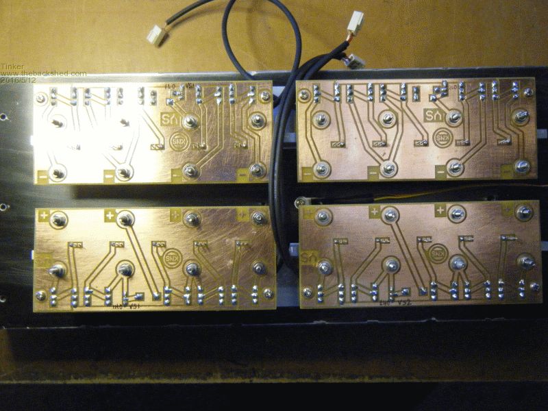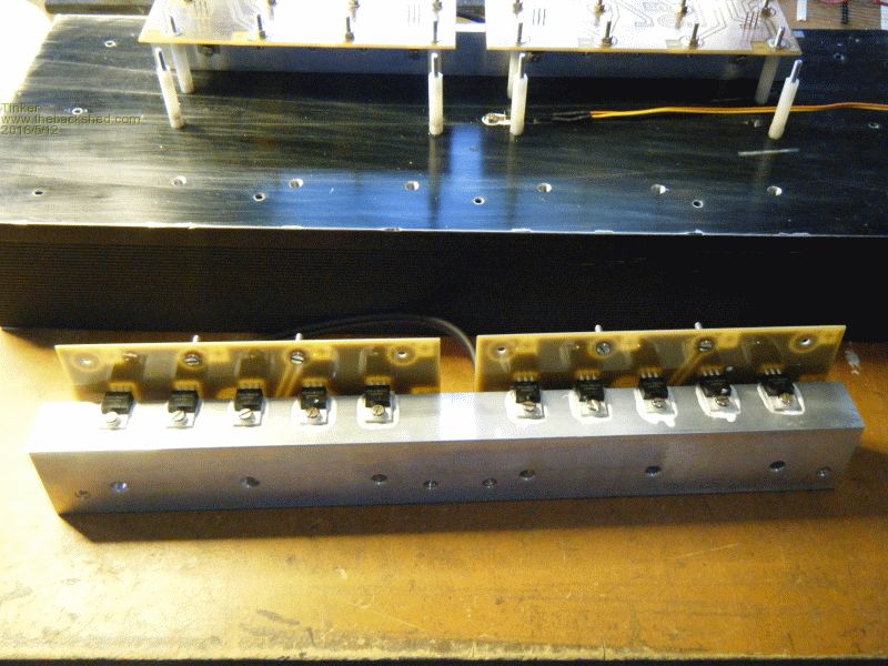 This is one of the two sub heat sinks. My design idea requires the mosfets to be fully insulated from the heat sink. I used mica washers and plastic screw insulators. I also tested each one with a home made 80V test lead (just a LED with a series 5k6 resistor) as testing with the usual low voltage multimeter buzzer would not do in this 50-60V application. Plenty of heat sink compound at the mica washers and between the sub and main heatsinks. A strict sequence of assembly has to be employed with this idea. Also the holes have to be drilled quite accurately so everything lines up on assembly. A hint if anybody is thinking of copying this; make sure holes drilled into the main heatsink go in between the fins. It is so much easier to tap a through hole than a blind hole. I used 6 x M5 hex bolts to screw the sub to the main heat sink. These are accessible from the side of the PCB above them, other screws would not be. Here are the 4 boards in place with the gate leads soldered on: