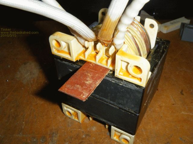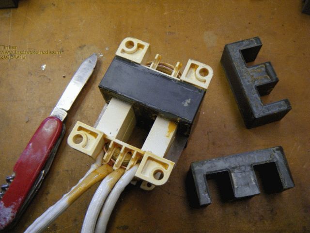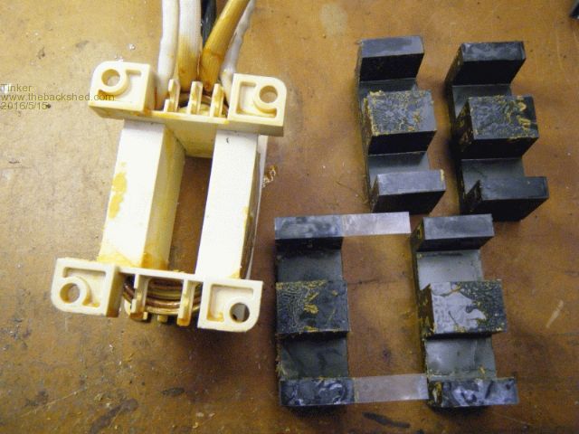 This came out quite easily with a 1mm thick brass strip being carefully tapped in from one side. Now the bobbin was loose and I had to separate the two E cores: