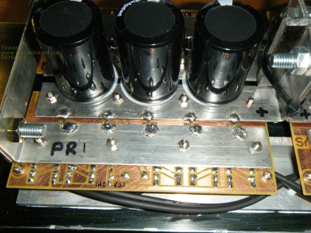 OK, more progress pictures. The 6 x 10,000uF/100V capacitors had arrived so I could solder them onto the copper strips. This turned out to be trickier than anticipated, a 25x1.5mm copper strip sucks heat away really fast. I used a 80W non temperature controlled iron which is a bit on the small side. I think a 100 or 125W iron would be much better. Anyway, I managed after giving the iron a short reheat spell after each solder joint.