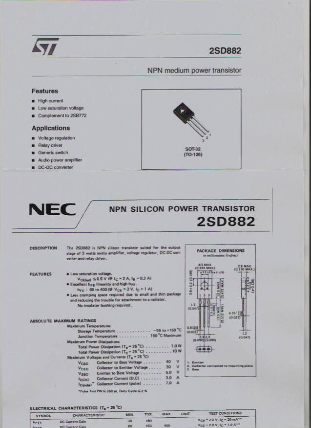Yes, other data sheets have the pins going the normal way with one on the left, and three on the right. http://www.alldatasheet.com/datasheet-pdf/pdf/77279/NEC/2SD882.html ![]() Cheers, Tony. |
