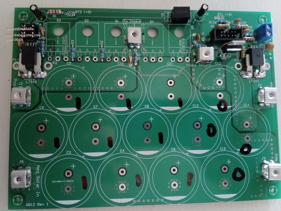 Mark: not to worry. This project will work with just about any reasonable collection of caps. No need to be exact. I would fit 4 caps to the output. The first board I built ended up donating all it's caps to the Wiseguy board build. And so I thought, what could I get away with if I took an attitude of "let's be stupid" when fitting caps? So this board has 1 x 540 and 1 x 450uF on the input. And 1 x 10,000 uF on the output. And the firmware still works fine when driving the 1 Ohm load. I suspect it will be also great when driving a proper sized battery. If I can make a suggestion, I would build just one board first. Have a bit of a play with it. Give it 50V input and configure it to charge a single 12V battery. This will give you a feel for setting up a board. Maybe make a big power resistor of about 1 Ohm and hook it up to the output. Starting with a blank Nano, load the firmware, connect to the serial console and load the defaults. (you will need to config the serial console firstly to run at 115200 baud. Then set it to send a "Newline" only when sending data) Assuming you have a brainboard and power board built and connected to each other, hook up the 50V. Then the 12V supply to the power board. Then, set the zeros for the two current sensors. Connect a battery. Now use the multi meter to check and calibrate the input voltage and the output voltage. Use the DC clamp meter to check and calibrate the output current. How to calibrate? have the mppt powered up, note the LCD, it will show "NIGHT" if not producing any output. Who cares, that is good enough to calibrate input voltage. DMM says input is 49.5V for instance.. send "C" to the nano After sending a "C" you will see "Input volts cal. Enter volts" Ok, tell it by typing 49.5 and press "send" a little while later, the LCD will now show 49.5V as input. likewise, we calibrate all the others. (Vin,Vout, Iin, Iout) And then set up all the charge program details. here is the latest code. It has a few small improvements. One is we define the NTC position in the voltage divider. It should be self explanatory. mpptv5_highside_NTC.zip The file has "highside" in it but it is flexible and can deal with either highside or lowside NTC positioning. wronger than a phone book full of wrong phone numbers |