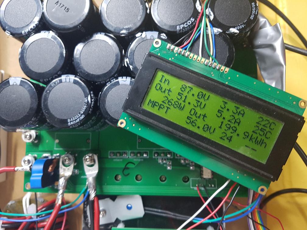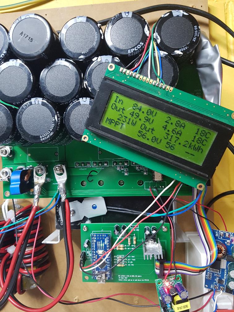 this is the menu now: A - max heat sink temp 65 degC 4 - H.S. throttle low 55 degC 1 - Fan ON temp 60 degC 2 - Fan OFF temp 50 degC 3 - NTC 5V or GND 0 (= 1 if 5V, = 0 if GND) C - cal. Input Volts 0.1748 ( 0.00 V) D - cal. Output Volts 0.0894 ( 0.04 V) E - cal. Input Amps 0.2401 ( -57.87 A) F - cal. Output Amps 0.2405 ( -58.38 A) G - zero Iin sensor 511 ADC counts H - zero Iout sensor 511 ADC counts I - Max battery Volts 60.00 Volts J - Absorb voltage 45.00 Volts K - Absorb tolerence 0.50 Volts 5 - Battery temp offset 22 degC 6 - BV tempco -0.20 Volts / degC 7 - Absorb BV std. temp 25.00 degC L - Maximum Current 45.00 Amps M - Night power 10.00 Watts N - Zero Energy total 0.00 kW.hr O - Equalisation voltage 15.00 Volts P - EQ duration 60.00 minutes Q - EQ reset tolerance 0.50 Volts R - Absorb duration 60.00 minutes S - Float voltage 13.00 Volts T - Float tolerence 0.50 Volts U - fast OC enable 0 (ON = 1, OFF = 0) V - pwm freq. 20kHz (20 or 40) Y - Calibrate mode 0 (1 = ON, 0 = OFF) Z - Write defaults I have a large battery temp offset of 22, since I am testing things on the bench and am using a 10K potentiometer to simulate an NTC resistor. I use an absorb voltage of 45V so that about 45 Amps is produced and sent to the 1 Ohm resistor. wronger than a phone book full of wrong phone numbers |