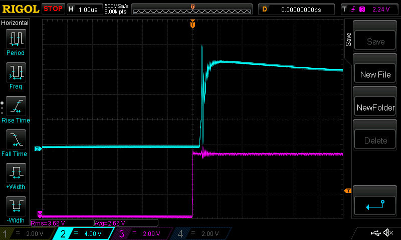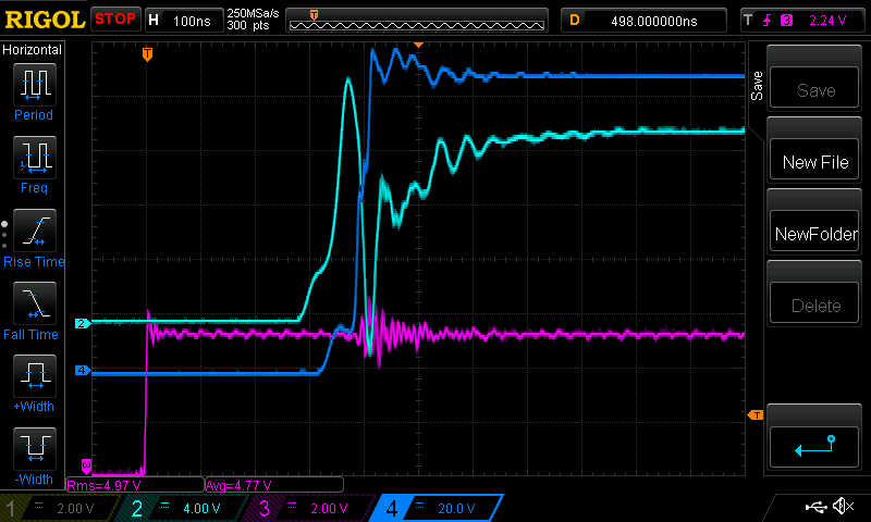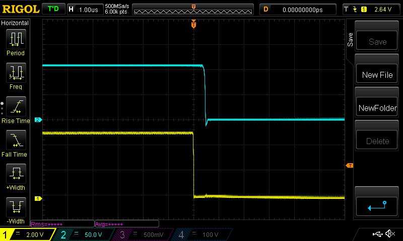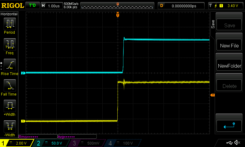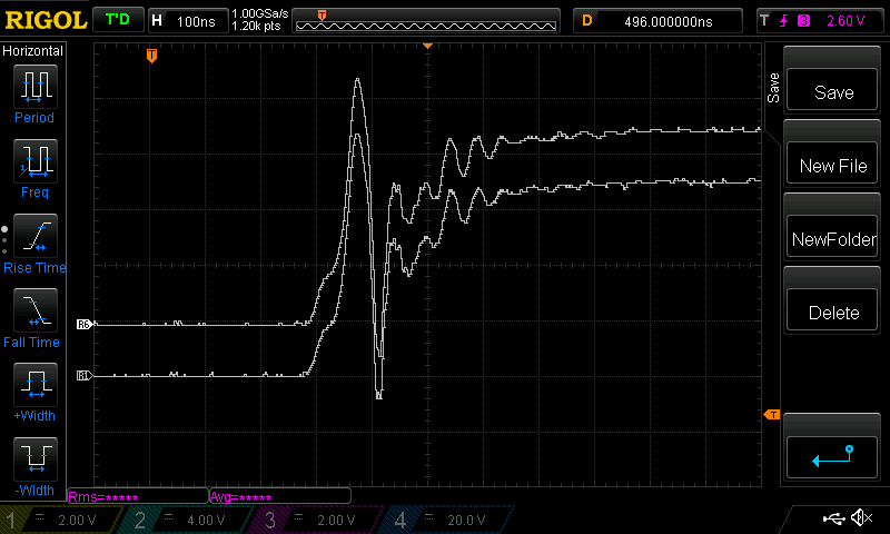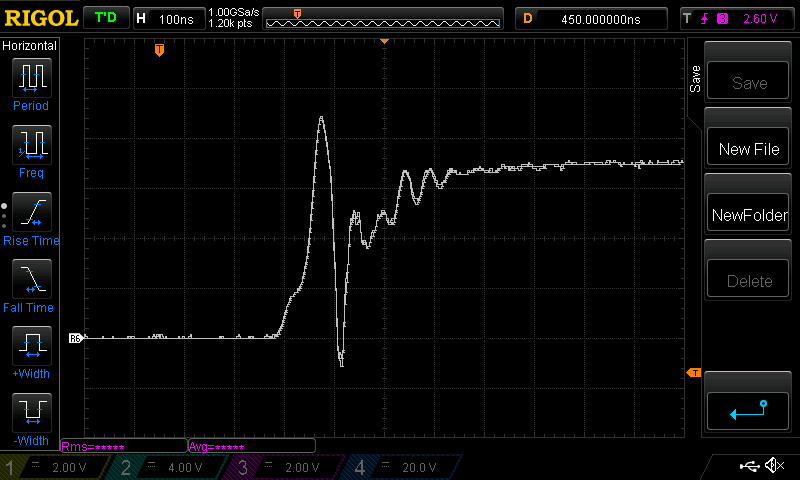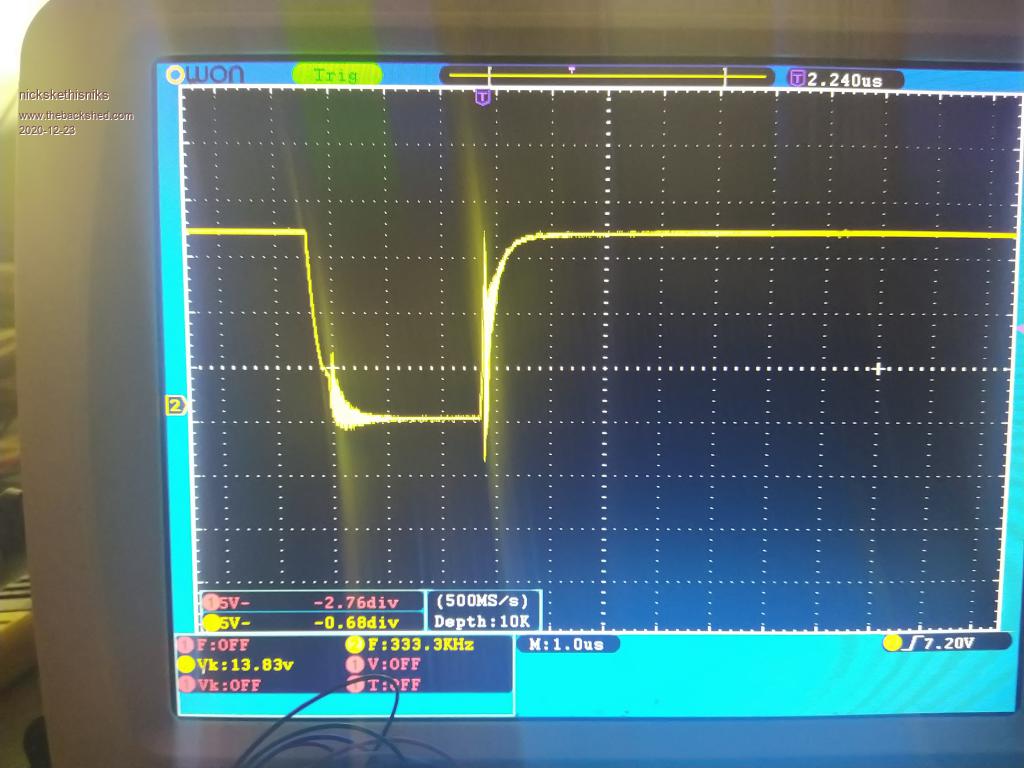 Yes that is, I like it's big screen a lot. I'm used to work with tektronix at work so there is a quality difference. But the owon is good value for the money and more than good for what I'm doing. I'm using SDS7072 which can also work on a battery, but I was on a budget 8-10y ago so didn't order it, but I can think I can hack that part now . I will switch to a 4 chanel scoop in the coming years, sometimes I mis an extra input. And maybe an differential probe.It was used for 5years in a not heated shed so it had a rough life temperature and moist, the potmeters/encoders for Volts/div and sec/div need to be changed. Sometimes if I want to adjust the timebase or amplitude it goes the other way around. This is what I use for testing gate signals: ![]() Peter I would like to see your gates/source signal, but you don't need to. I'm just looking for improvements that can be made in my next designs, it's allways a trade of between lots of things .In a next order I will try to order that mosfet you are using just to compare .I will try testing the switch node, but it's a clouded day (200watts...)for this moment so probably not much interesting to see on the scope. I'm sure this signal looks much better than what I see on my mosfets gates. Edited 2020-12-24 20:46 by nickskethisniks |