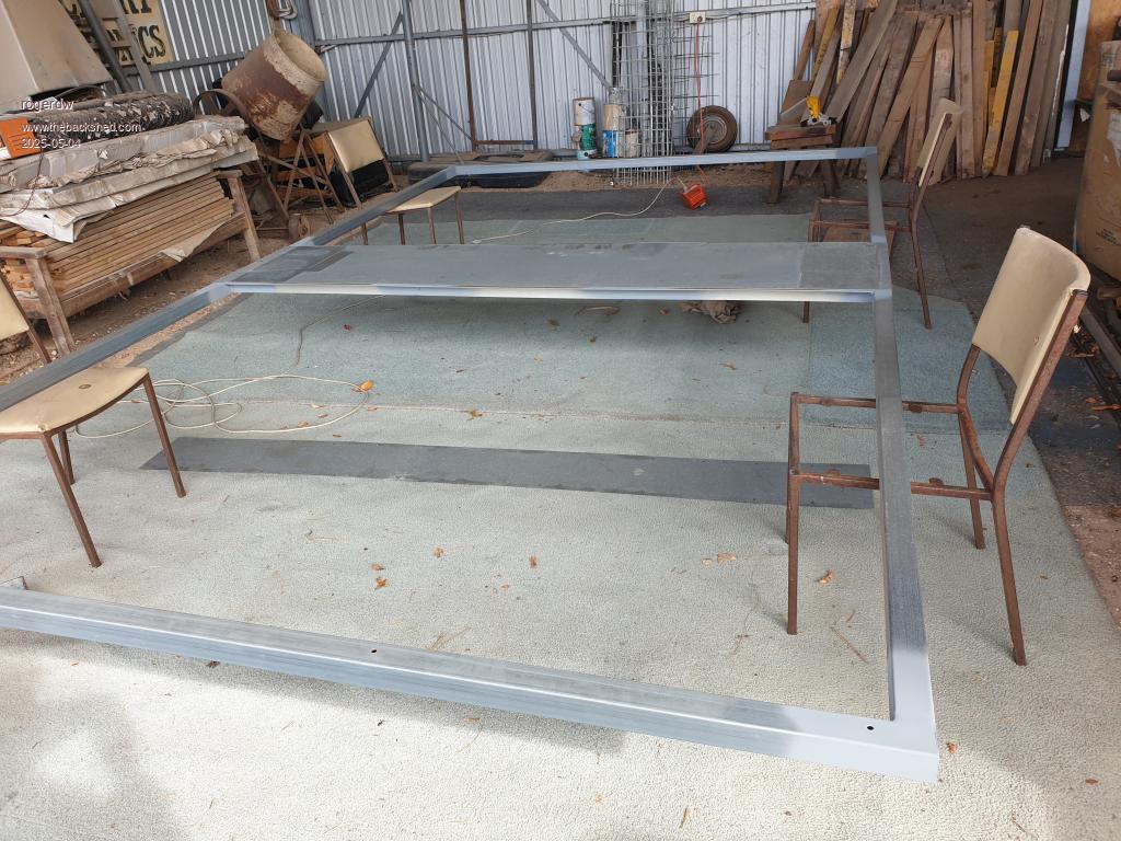 I also spent some time on the roof checking exactly how it would fit  ...  and discovered that if it was 200mm longer, I could just reach another two rafters. That would give me 8 mounting points at the top and 8 at the bottom, rather than just 6 top and bottom. So I welded an extension on each corner. I had been adding up individual weights and saw it would be close to 300kg when it is finished  ...  so the more supports the better.