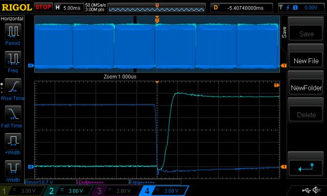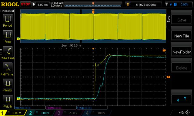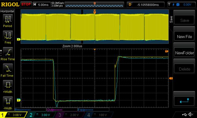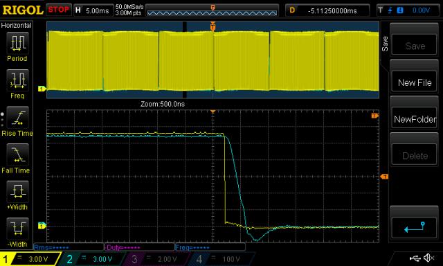 We can clearly see the fast edges of the IR2110 and the totem pole output is a little slower. Notice that there is nearly identical duty time between the two.