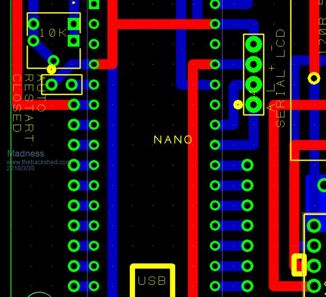 Some comments from the .png pictures: Are the 2 capacitors under the EGS8010 adapter pcb low profile and will not interfere with the bottom of the adapter pcb? There seems to be a 4-pin serial LCD interface. If you are using I2C, please check the signal pin numbers of the I2C coming from the nano. From the pdf, looks like mounting holes are spaced about 2.8" (71mm) and 9.5" (241mm). Maybe add mounting hole in the middle of the 241mm so that the PCB will not flex too much when inserting/removing the adapter pcb. Too busy at work right now, if I have extra time I will look at them some more later. |