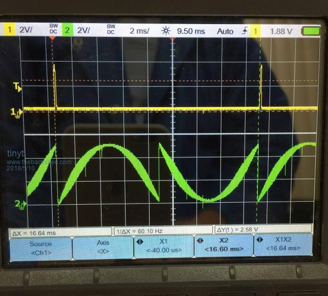 I am still playing and learning from POIDA's code (pre-modified for 60Hz): To find out if it can sync on an external signal, I added the following in setup: // MOD: added the following 2 lines EICRA = _BV(ISC01) | _BV(ISC00); EIMSK = _BV(INT0); And also the following: ISR(INT0_vect) { if (pcount < 50) // Arbitrary window. { TCNT2=126; // Reset as if pcount=0; // Timer 2 overflow TCNT1=0; // happens } } I used a pulse generator set to 60Hz repetition rate and fed its output to the INT0 pin of the NANO and monitored the SPWM output of OC1A of the NANO. I get this scope capture. Yellow is pulse generator and green is the SPWM (scope is bandwidth limited). Scope is triggered on the yellow trace signal. The green trace is locked steady with the yellow trace. ![]() For reference, I disconnected the INT0 connection and video clip captured the scope. It shows the no sync condition. 2018-05-10_050530_OC1A_Output_NoSync.mp4.zip |