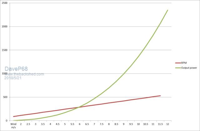 Here is another graph of Wind Power vs RPM, note the RPM is linear and the power follow the cube law of the wind speed.