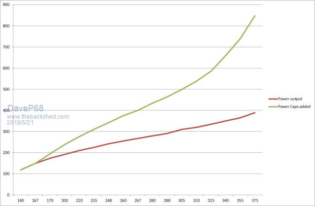 A graph of the difference in power output with them added 852W at 375 RPM and without 390 W at 375 RPM.