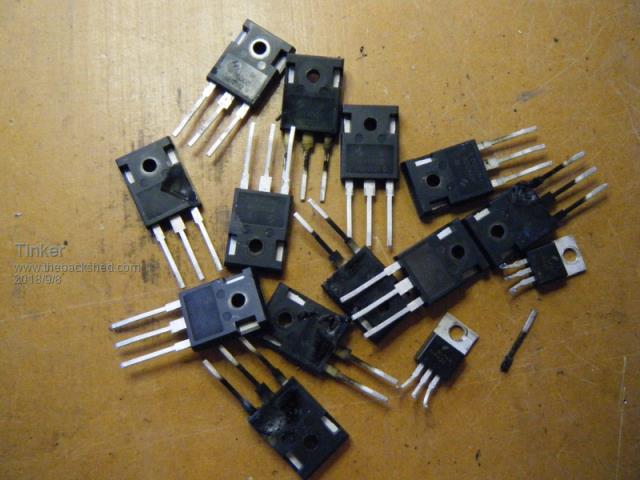 It has been a bit quiet here lately so I thought I'd amuse you with my exploits .The idea was to find out why my inverter has spurious 'brownouts' when a very heavy load comes on. For this I used my test inverter (inverter #4). So I had it connected up and running with various loads when I noticed I did not have the IFB signal connected to my control board. The load was switched off and the inverter was idling when I attempted to plug in that wire. Bad idea .This is what happened: Big bang, bright flash and fire. The most spectacular blow up yet .![]() All of the 12 mosfets self destructed, the ones at the low side caught fire by the time I disconnected the power. ![]() This close up shows that the screw terminal idea works well for a blow up but the terminal got too singed by the fire so three of them require replacing. That was the only solder job I had to do, the PCB had no damage and cleaned up nicely. Two of the totem pole transistors (TIP42C) also shortened on the low side but as these are on screw terminals are easy to replace. Here are the casualties: ![]() Lesson learned: Do turn off the inverter before plugging anything in or out. Klaus |