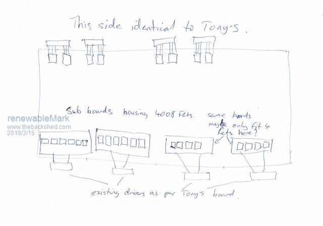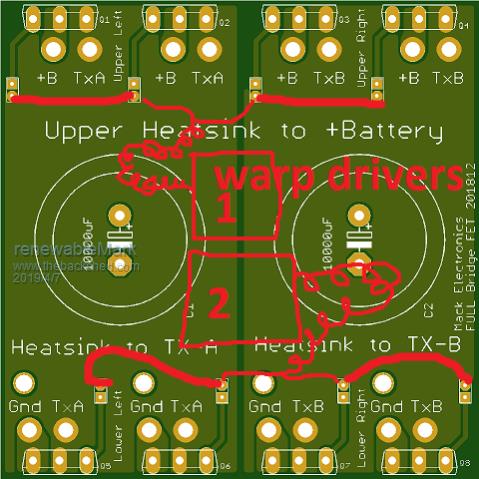 I'm trying to work out how to use the existing designs to make a fet driven Warp machine. Mack's construction confuses the hell out of me, but I can get my head around your one Tony. So is it possible to use the std Warp control board and the 8 warp driver boards, but send the signals to the Mack fet board, so each twisted pair would then be separated and sent to each 1/4 like this. ![]() Cheers Caveman Mark Off grid eastern Melb |