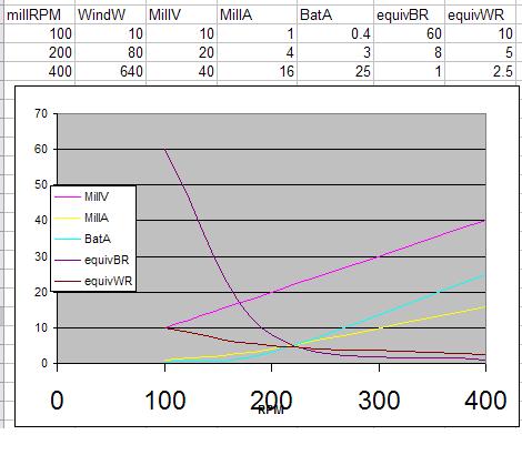 I have just gone through some of the relationships that an ideal windmill has to have. I have taken 3 points only in the wind energy spectrum An initial say 10W at the shaft, 80W, and 640W. This corresponds to a doubling and doubling of an initial windspeed giving a starting wind energy of 30W for the particular rotor. Ideally the TSR should be constant with increasing windspeed. assume the 10W gives 100rpm and we have a nom 24V battery. [A battery presents a very low impedance] this is a sort of table for the power relationships at the various wind energies. I have tabled approx wind energy to mill rpm and mill voltage and calculated current and then battery current. WindW = wind power at shaft millrpm millV = loaded mill voltage millA = loaded mill amps BatA = battery amperage equivBR = equivalent resistance at battery voltage to dissipate power equivWR = equivalent resistance at windmill voltage to dissipate power. The battery and windmill are not anywhere near the impedance that is required. A series capacitor creates this type of matching, as at low frequency/rpm it is a high resistance and as the frequency increases the impedance drops. I do suspect that the series caps cannot boost the voltage, so a separate boost method is required, but above the battery voltage the caps perform the required function. I need to follow up with some more testing of currents. Gordon. PS the capacitor should not be a value calculated at series resonance. become more energy aware |