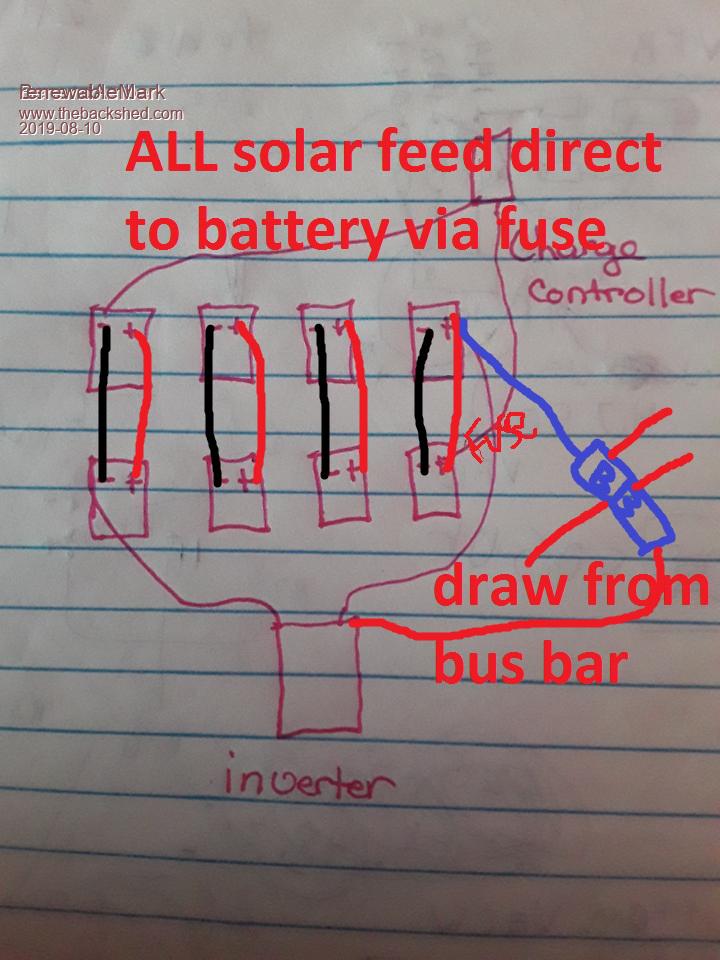 Hey Ben, I thought I would reply to your question in your thread so not to confuse Poida's one. Don't be afraid of bus bars. They are totally fine if done properly. Draining power is no problem whatsoever with a bus bar. FEEDING input (solar) charging power should go direct to the battery via a fuse. ![]() Every single set of instructions for charge controllers will show every time to connect direct to the battery via a fuse, NOT to a bus bar a metre or two away from the battery. So put a bus bar on the DISCHARGE cable, that's fine. These are my thoughts and John here has also found doing this simple wiring change has STOPPED failures. I built and blew 4 inverters in 4 days. Then I changed the solar feed input direct to battery, built another inverter and WHAM, all my problems were gone. My house is still running from that inverter, it's powering the screen I'm typing on. I still have a common bus bar on the drain, but NO input power gets connected to that point. Perhaps JohnMC could tell you some of his experiences to further the point. . Edited 2019-08-10 19:55 by renewableMark Cheers Caveman Mark Off grid eastern Melb |