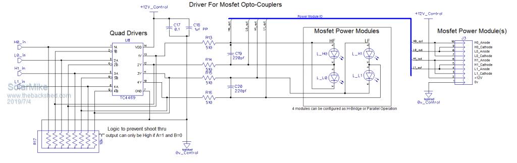 The power module a few posts back already has on it an isolated DC supply and an opto mosfet driver, so four would be required + the above circuit to make it work. The quad driver chip being used TC4469 has four 1.2A cmos drivers on it each with dual inputs, so can be arranged to prevent two outputs becoming high at the same time, over kill for driving 10-15ma into an Led, but its all on one ic so more convenient.