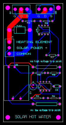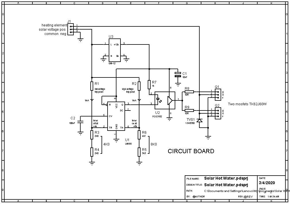 Here is my WarpsHotWater circuit, have not tested it with solar panels, only with 120v power supply seems to work.