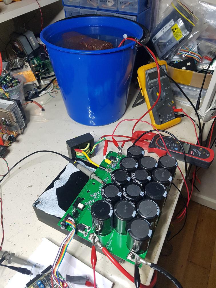 Resulting from these tests today the heatsink gets about 5 C warmer, the inductor about the same. And I have some very disgusting smelling hot water in the bucket.