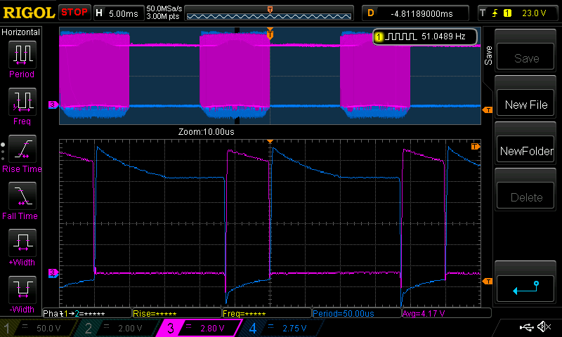 I want to show the Gate voltages for the new board. I am very happy how they look, and they appear quite similar to those on the Madness 6kW power board. This no surprise. Purple is low side Gate drive voltage Dark Blue is high side Gate voltage 50V input, 200W load ![]() and close-ups of the Off and On switching of the half bridge Off: ![]() On: ![]() This is perfectly acceptable and no doubt this clean Gate drive is what permits the power board to survive 11kW with 3 x 4 FETs The droping voltage over time is present in the Madness power board as well as mine. I see no problem at all with this. The FETs are fully switched ON during the period where the voltage drops. When the HY4008 is fully switched on, the Rds(on) resistance is 2.9 mOhm The HY4008 specs show Rds(on) resistance is already 3.0 mOhm at 7V We can see minimum Gate voltages of about 12.3V or a bit more so there is a large margin of safety here. Very pleased to see this. wronger than a phone book full of wrong phone numbers |