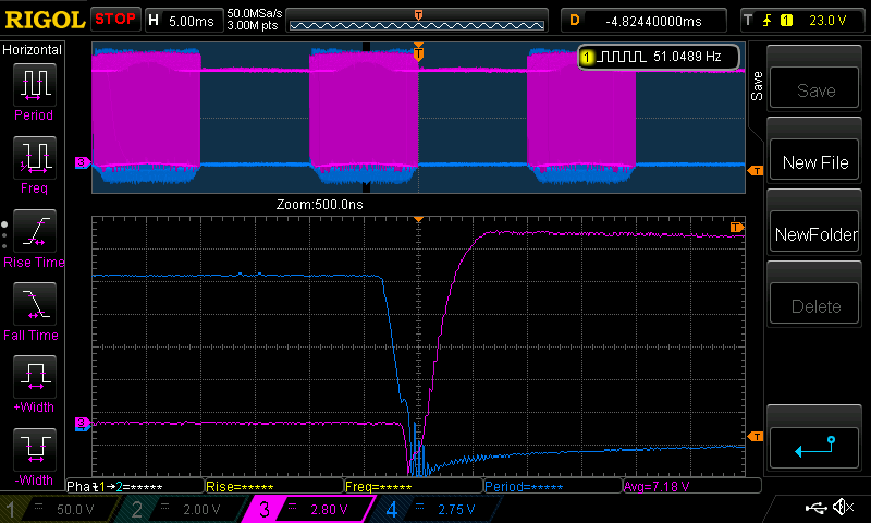 Haxby, that part of the switch on means the high side is being pulled up to DC. This rapid change in the low side Drain pin means the capacative coupling will cause the Gate to rise, as we can see in the Purple bump. It's probable that the low side FET is conducting a bit, now and then, driven towards some natural frequency. It's normal and expected and it does not lead to destruction (your mileage may vary, etc.) I have trialed ferrite beads on a few of the pins but not much is gained in my experience. It might be good to slow down the natural frequency of the high side Source/Low side Drain node in some way. wronger than a phone book full of wrong phone numbers |