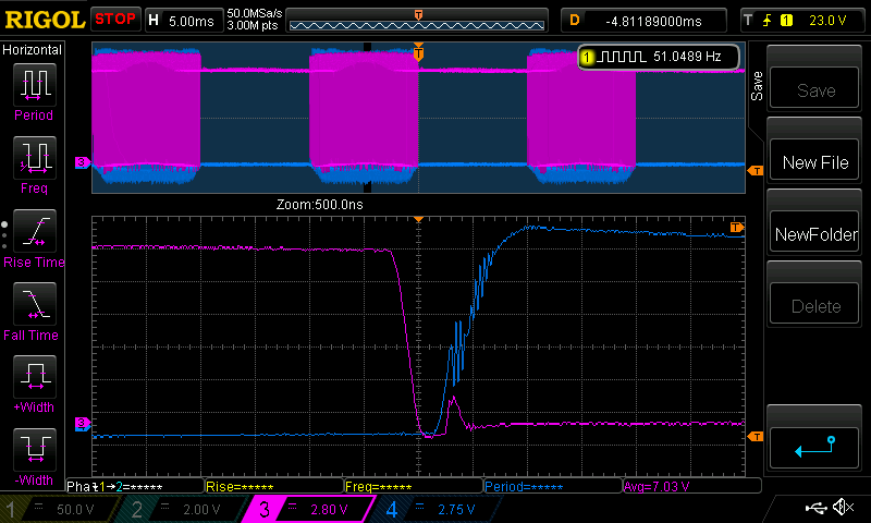 Hi Peter, I recognize this as oscillation in the miller plateau. When I tested a lot of MOSFETs and igbt's I had results like this, 1 way to improve this is adding some gate capacitance and fine-tuning the gate resistor. The results differ from device to device, ixys MOSFETs came out best, the huy4008 was better then most IRF MOSFETs. There was no 1 fits all solution for this. Don't know how you measured, by know you use probably the best techniques. But I noticed if I measured at the legs of the fet itself, just before they enter the package.(best results) It gave very other results then measuring on the legs more near the PCB. (Worst results) So things could actually be better then how it is presented now. This was the first explanation I came a cross, it's not long to read, there are better documents describing this fenomenom/solution but I need to look for it. They discribe igbt's but it's true for MOSFETs as well. miller plateau This is a copy of other available pcb's so I'm sure things could be improved by simple improvements. Component placement and track length/symmetry could probably be improved. I want to improve my knowledge on this, I think that a HF course would help for this kind of things, but time... Edited 2021-04-29 12:28 by nickskethisniks |