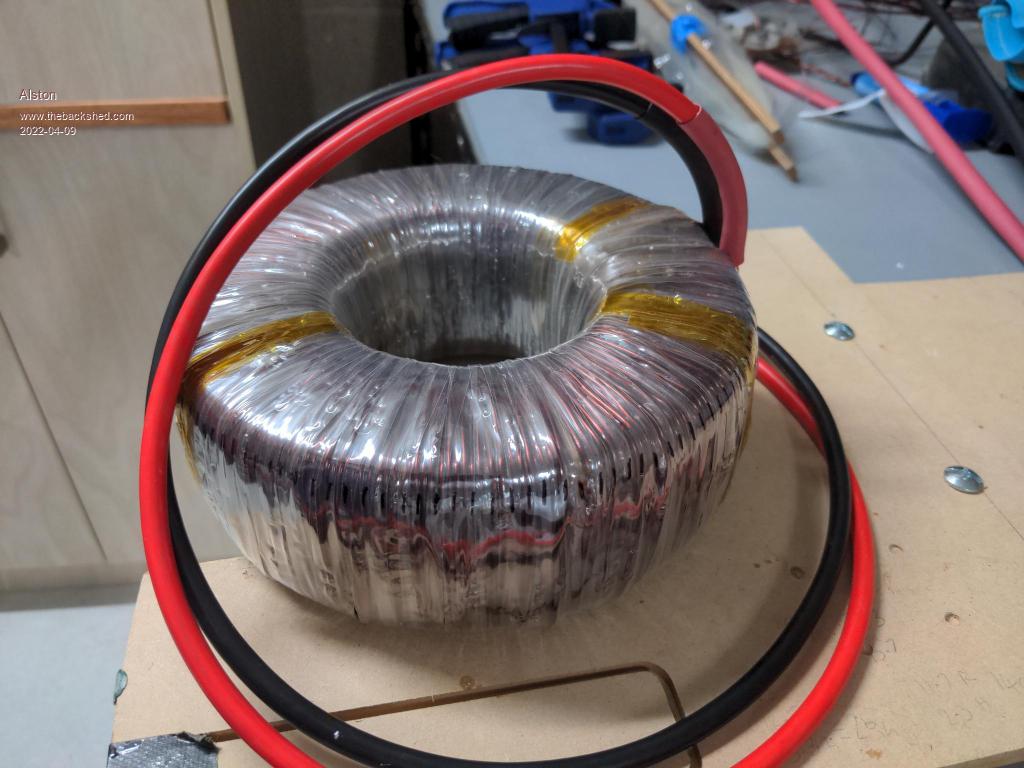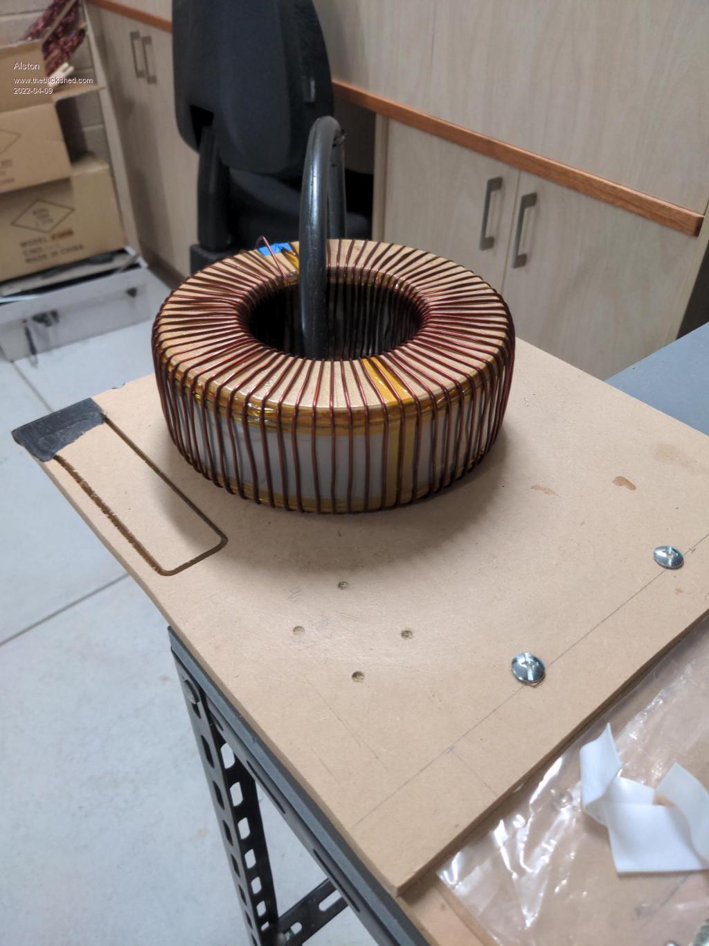 My large transformer is 270mm in diameter and 175mm tall  ... without the primary wound on it yet  ...  which doesn't sound all that large  ...  but when you see it sitting there it looks massive. And when you go to shift it, you really get an idea of its mass. Something like 46kg so far!!!
