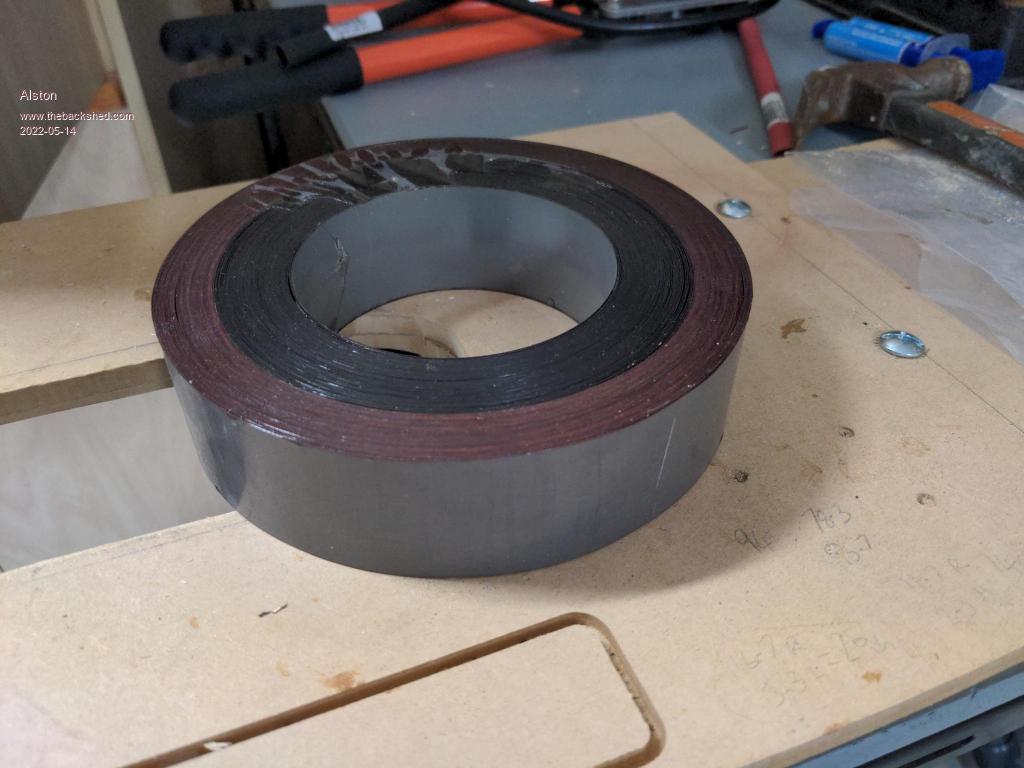 I have completed winding the core and making the end caps on the CNC. I CNC them a bit oversized, epoxy them on and once dry use a trimmer router with a flush trim bit to get them to exact before running the round over bit on them. With the smaller divisions on this transformer I had a  bit of blow out near the edges but that doesn't really matter. For scale this core is OD:165mm ID:90mm and H:40mm (without endcaps)