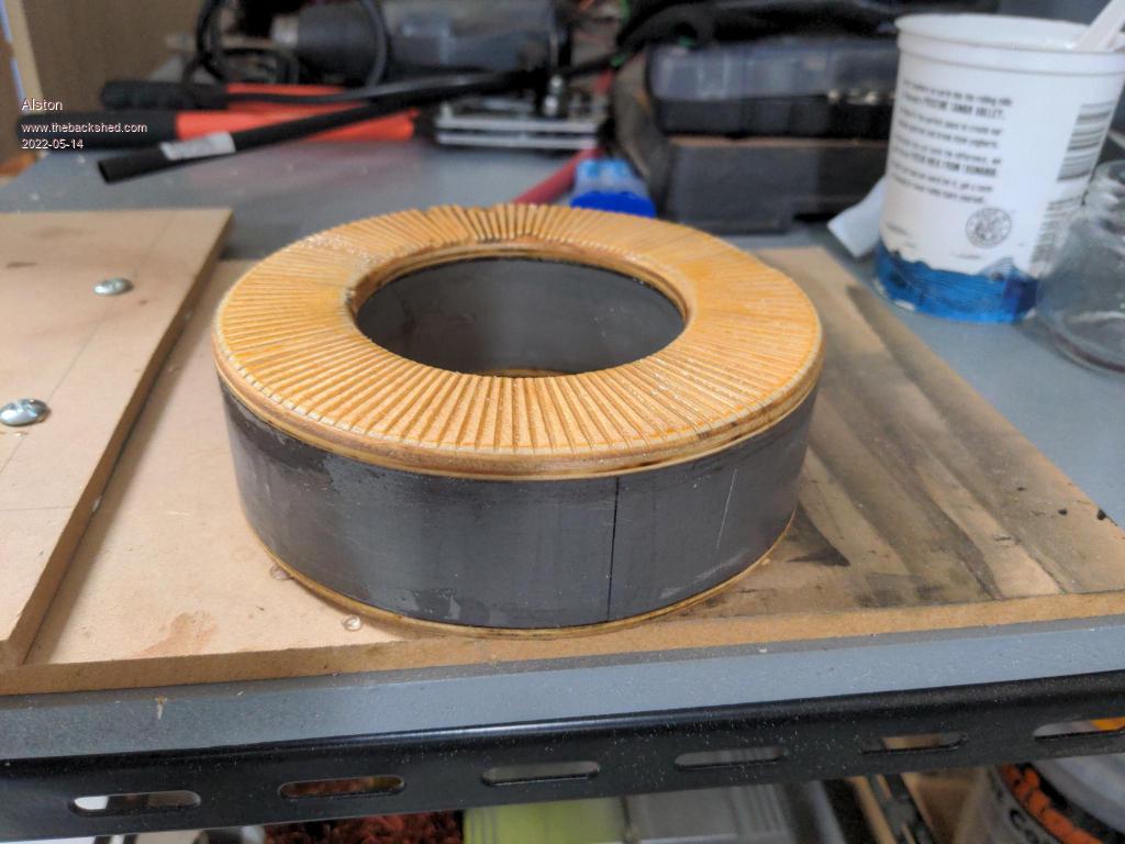 Transformer 3 is all complete and I have started on TX 2. I could not find a suitable core so I am winding one from some smaller ones I had. Here is a photo of my very crude setup that seems to be working well. I didn't go to the effort of spot welding them and instead used epoxy. By the time the endcaps are epoxied on I figured it will be pretty well all glues together.