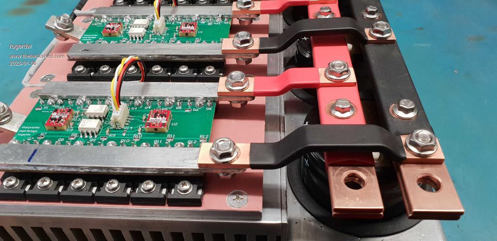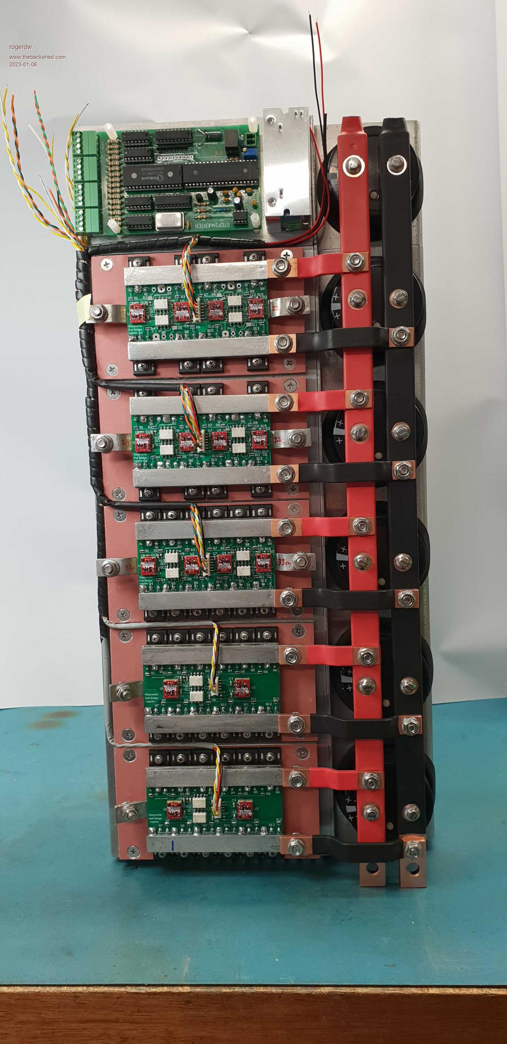 Thanks Klaus. Yeah I like the look of newly polished copper too but not when it's all tarnished. I like your idea for tinning though, I had not thought of that way. I have a 120W soldering iron I bought for some job many years ago and that worked really well to tin and solder the bars that I soldered to the boards ... a lot better and quicker than I expected. I did start off trying to tin them in a solder bath ... but at only 100mm in diameter it was a bit messy. In the mean time I have fitted heatshrink to much of it to help protect against accidental shorts etc. Maybe I could have masked the connection areas and used a clear laquer on it ... but no going back now. Whoops, I hadn't thought of that either. I'll see how it goes I suppose. My initial thoughts were to keep them flat so the cooling fan can blow up through the centres ... but of course with most of them virtually full of wire, very little air will get through anyway. If it becomes an issue, maybe I can tip a couple on their side. Thanks, it was just some stuff I had lying around and seemed to lend itself to the idea. It would look a lot neater if there was a cap on the channel top and bottom, but I recognised it would be important to keep them cool too ... so I'm leaning towards a barrell fan all the way across the bottom ... blowing air through the capacitor channel as well as past the heatsink and toroids. ![]() ![]() Cheers, Roger |