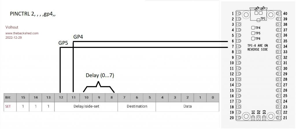 We configure the pins in PINCTRL where SET has 2 pins (GP0,GP1), with base GP0. We shift IN from GP2, so the IN base is GP2.