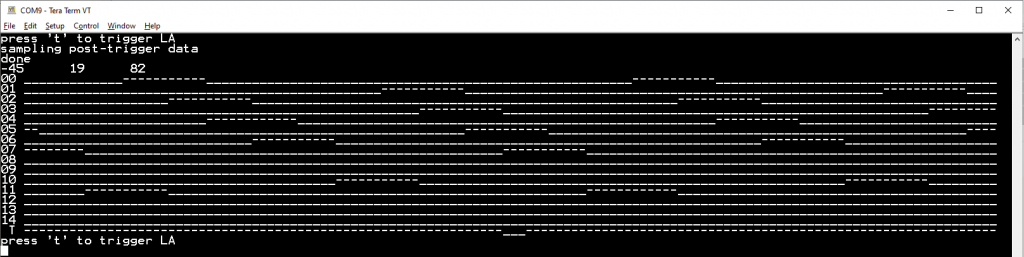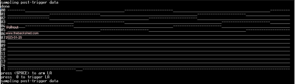 Hi Peter, I hope you can help me. Attached ZIP has 2 programs. LA_4.bas and LA_5.bas. The program LA_4.bas is the logic analyzer that works as I expect. If you type "t" repeated, it shows the sampled data from the 15 input ports of a picomite. Using V50707b7 If you connect GP22 to GP15 you also see the trigger. Then program LA_5.bas This program shows corrupted data in the last 128 samples of the data%() array (alternating correct value, next sample 0). Only the last 128 samples. If you change the value of "samples%" from 512 to 256, or 1024, the last 128 samples show this behaviour (the numerics show the start pointer, mid pointer, and stop pointer of the displayed values). You may have to type "t" a few times. When start%<0 or stop%>samples%-128 it is visible, commented out is a section that displays the data that is in the packed%() array. And also the packed%() array shows this artefact. The last 64 values seem corrupted. And I have no idea what is going wrong. The PIO code is the same, the DMA configuration is the same. The levels of the signals on my breadboard are correct. I have looked for hours, and cannot find what is going wrong. Have stripped LA_5.bas back to almost identical to LA_4.bas. I have no idea. I hope you can spot what is going wrong. Volhout LA.zip ![]() Edited 2023-01-21 08:09 by Volhout PicomiteVGA PETSCII ROBOTS |
