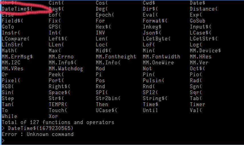 I may have missed some details somewhere, but on FRESH install of PicoMiteWebV5.07.07a24.uf2, if the only thing I setup so far is the WIFI so I'm connected... If I type: > datetime$(1679228317) Error : Unknown command > Above is what I get. Did Adding TFTP and NTP support remove working with EPOCH time to set TIME$ and DATE$? |