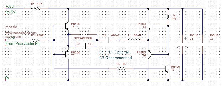 @Bill 220R protection resistors are a great idea, will fit just in case I have tried the circuit with and without filter and the only difference is slightly increased audible hiss without (on 3v3) and higher current draw: current Filter No-filter 3V3 55mA 68mA 5V1 80mA 100mA @Tom Toms_Tunes.zip Above recording is with filter as shown on bridged emitter follower circuit, without filter sounds no different to me but the microphone pics up the carrier and causes problems with recording, so its definitely there PLEASE NOTE: Recording made through my SPL meter microphone as its all I have that'll work with a sound card on this PC, and I know it has filters in it but the output sounds pretty close on playback. Another issue I think is with Play Sound itself, modulation is 25% with 1 sound, 50% with 2 sounds etc. so you only get full output with 4 sounds running. Play Tone and Play WAV are 100% modulation and generate far more output (quite loud) this is what my scope tells me anyway. Regards, Lyle. P.S. I'm running 5.07.07b28 and the speaker is a 35mm / 5w / 8R in a plastic enclosure, probably not much response below 200Hz Edited 2023-03-26 13:45 by mozzie |